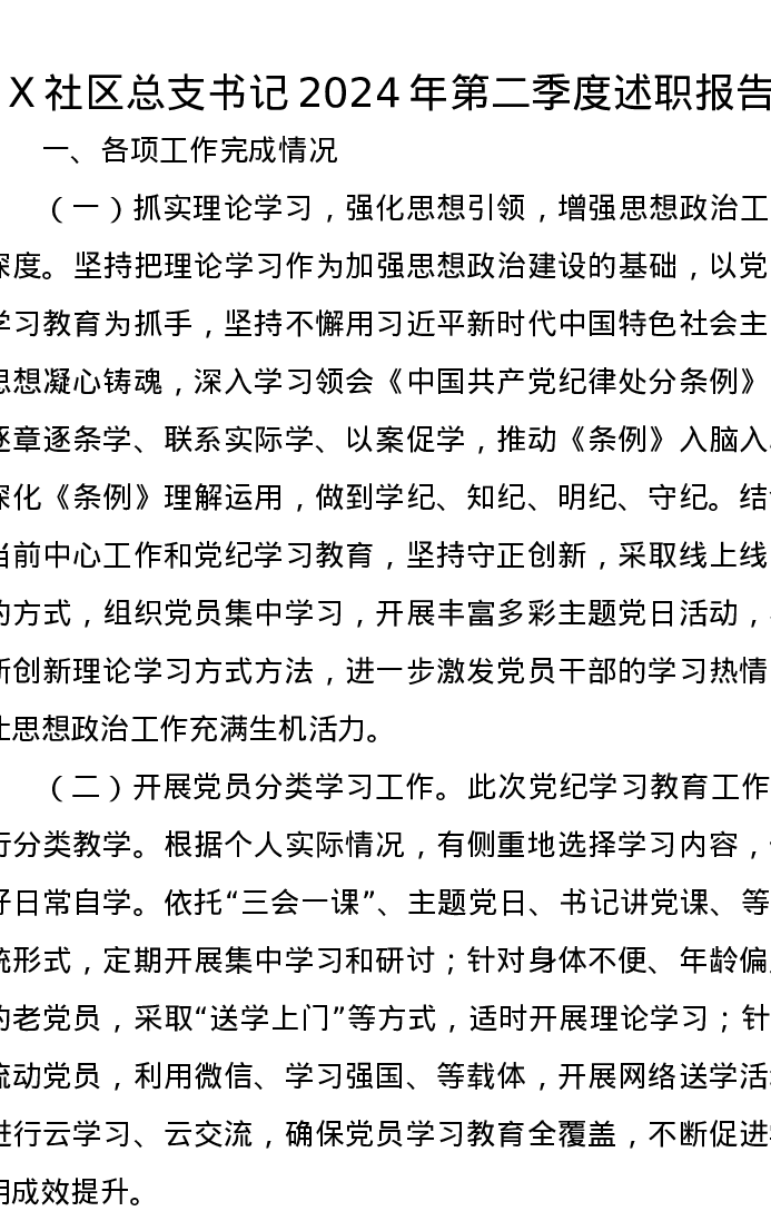 X社区总支书记2024年第二季度述职报告
