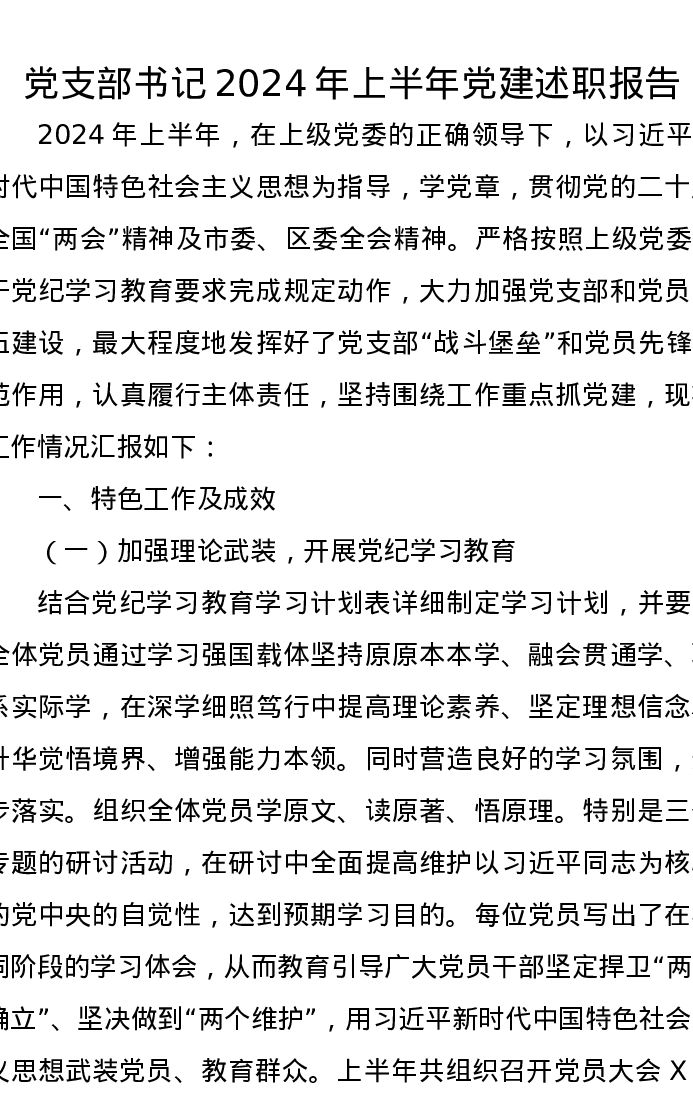 党支部书记2024年上半年党建述职报告