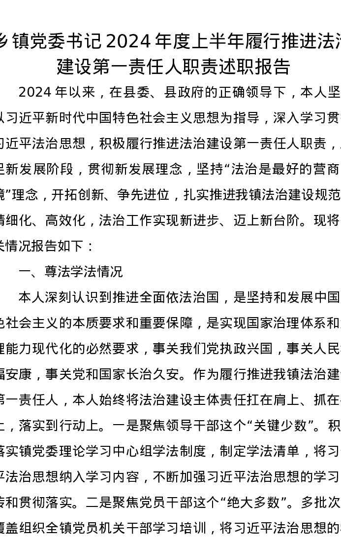 乡镇党委书记2024年度上半年履行推进法治建设第一责任人职责述职报告