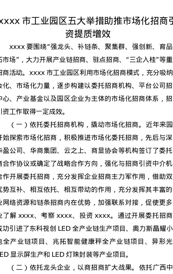 xxxx市工业园区五大举措助推市场化招商引资提质增效发言