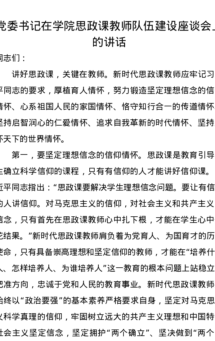 党委书记在学院思政课教师队伍建设座谈会上的讲话