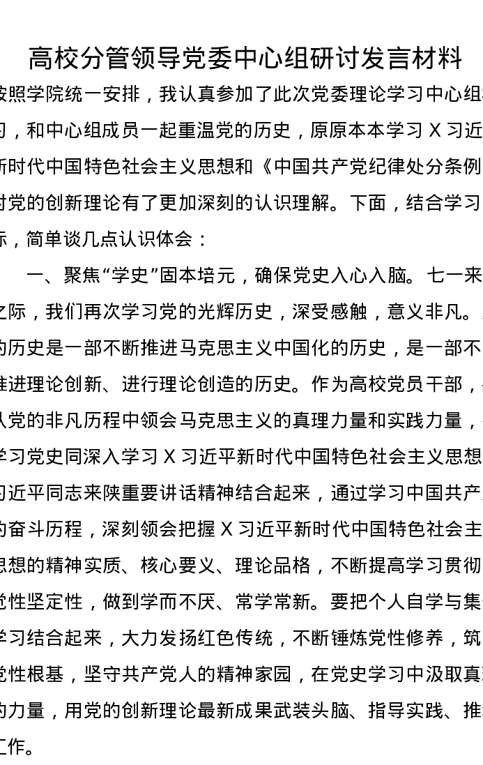 高校分管领导党委中心组研讨发言材料