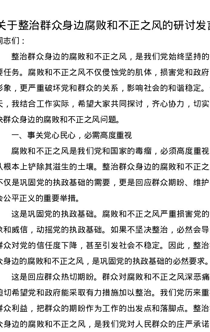 关于整治群众身边腐败和不正之风的研讨发言