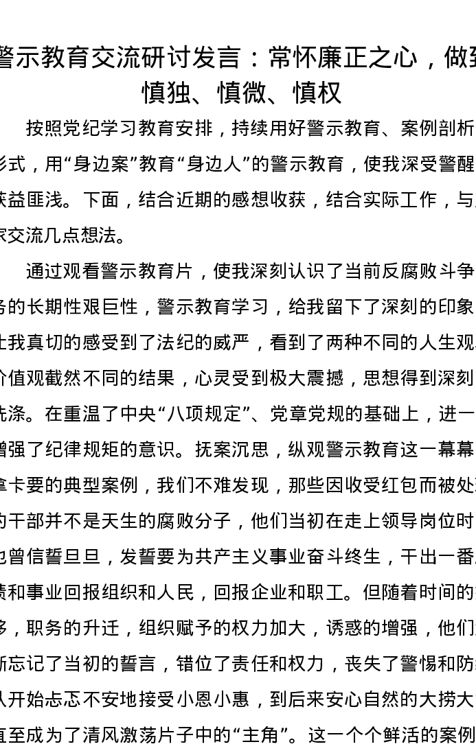 警示教育交流研讨发言:常怀廉正之心,做到慎独、慎微、慎权
