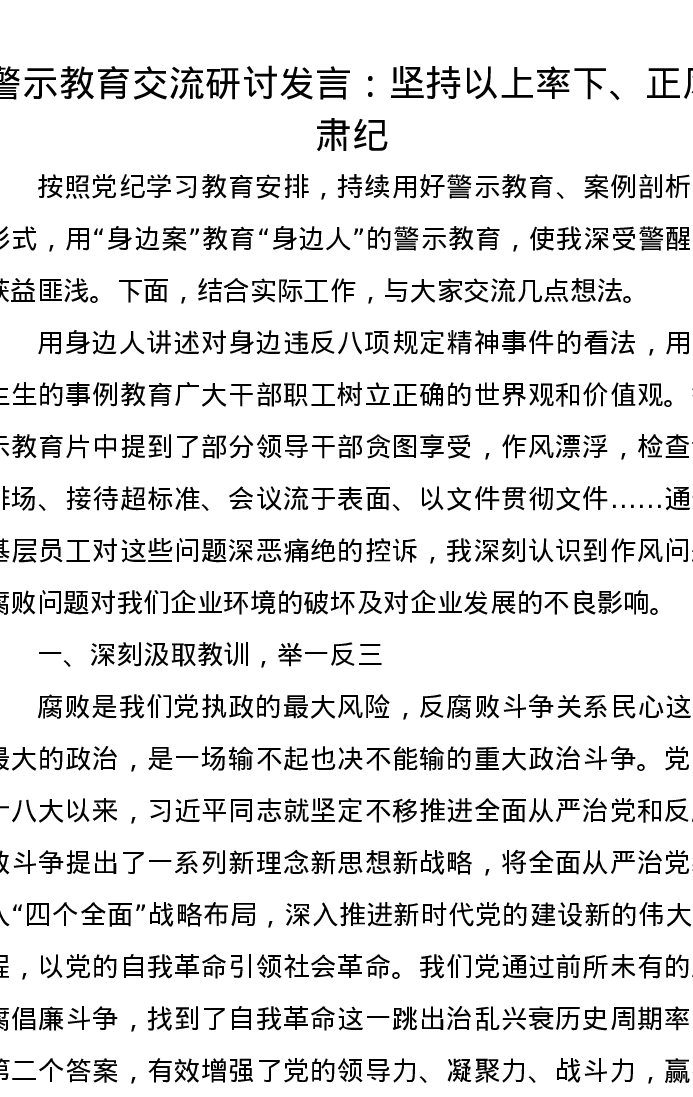 警示教育交流研讨发言:坚持以上率下、正风肃纪