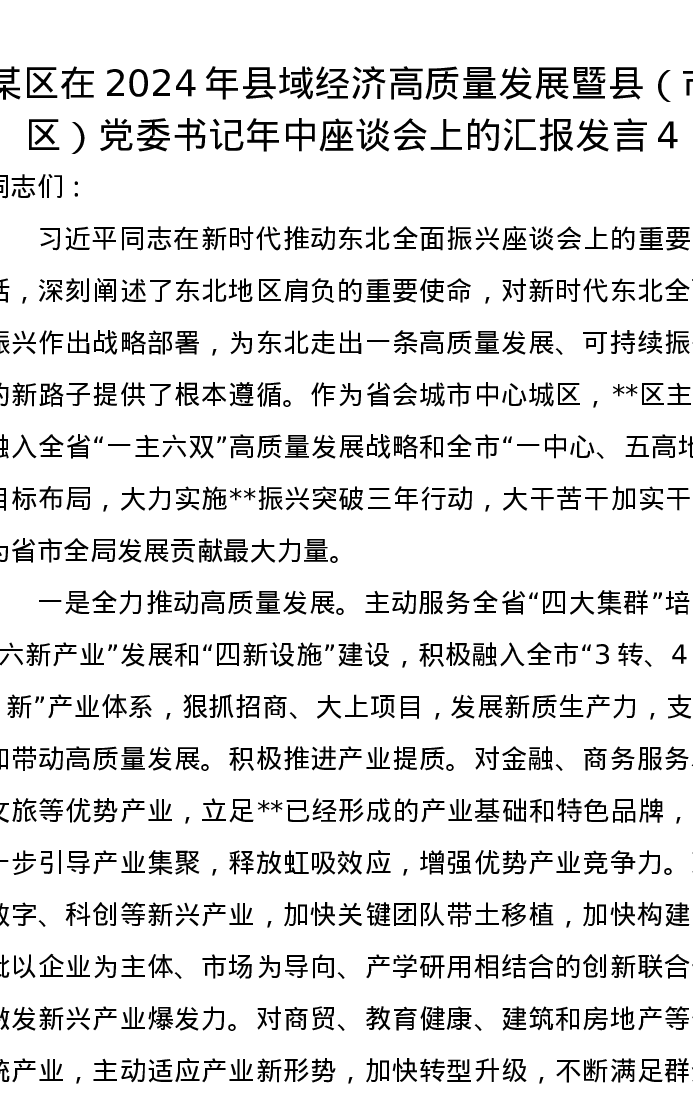 某区在2024年县域经济高质量发展暨县(市、区)党委书记年中座谈会上的汇报发言4