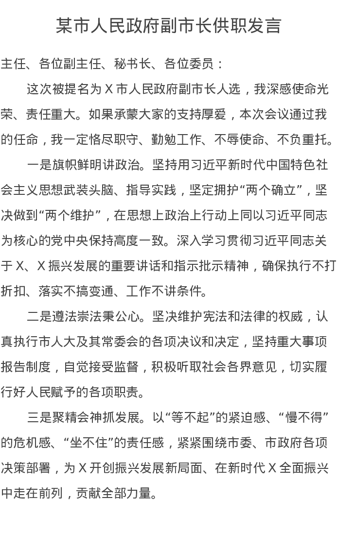 某市人民政府副市长供职发言