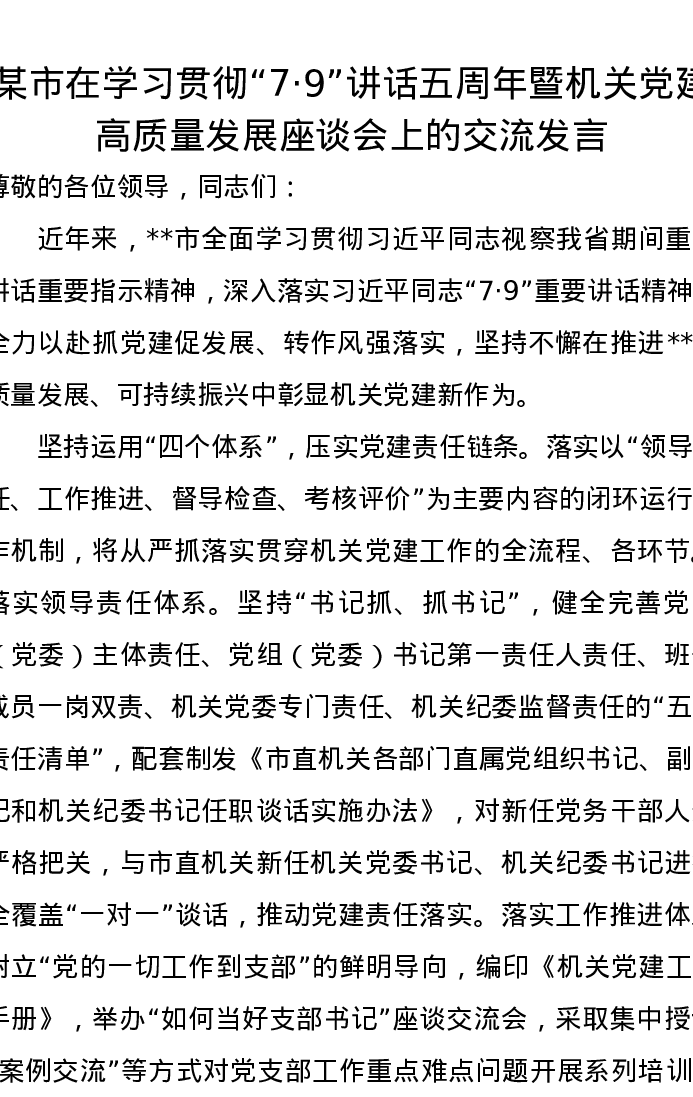 某市在学习贯彻“7·9”讲话五周年暨机关党建高质量发展座谈会上的交流发言