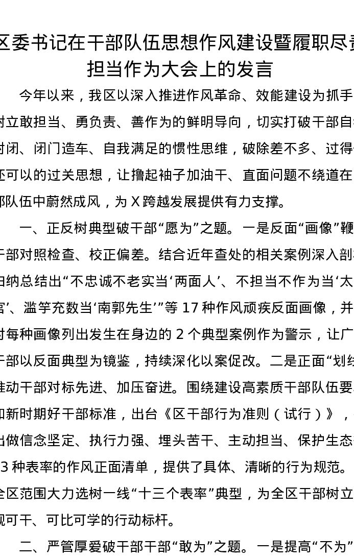 区委书记在干部队伍思想作风建设暨履职尽责担当作为大会上的发言
