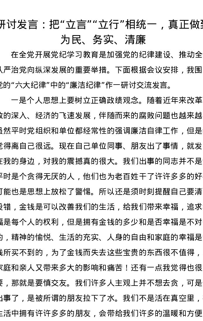 研讨发言:把“立言”“立行”相统一,真正做到为民、务实、清廉