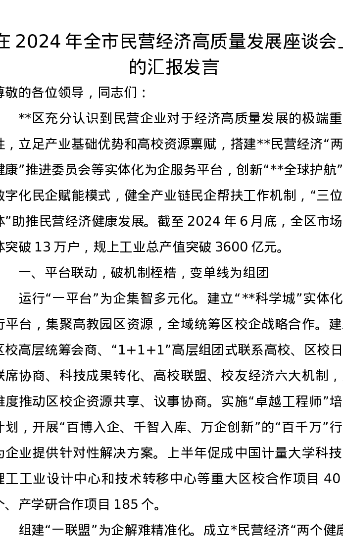 在2024年全市民营经济高质量发展座谈会上的汇报发言