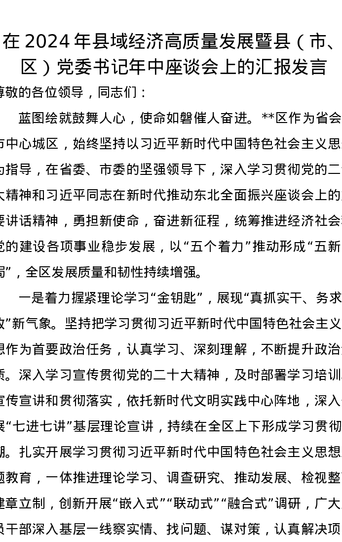 在2024年县域经济高质量发展暨县(市、区)党委书记年中座谈会上的汇报发言