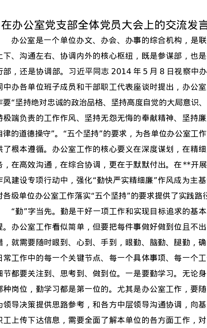 在办公室党支部全体党员大会上的交流发言