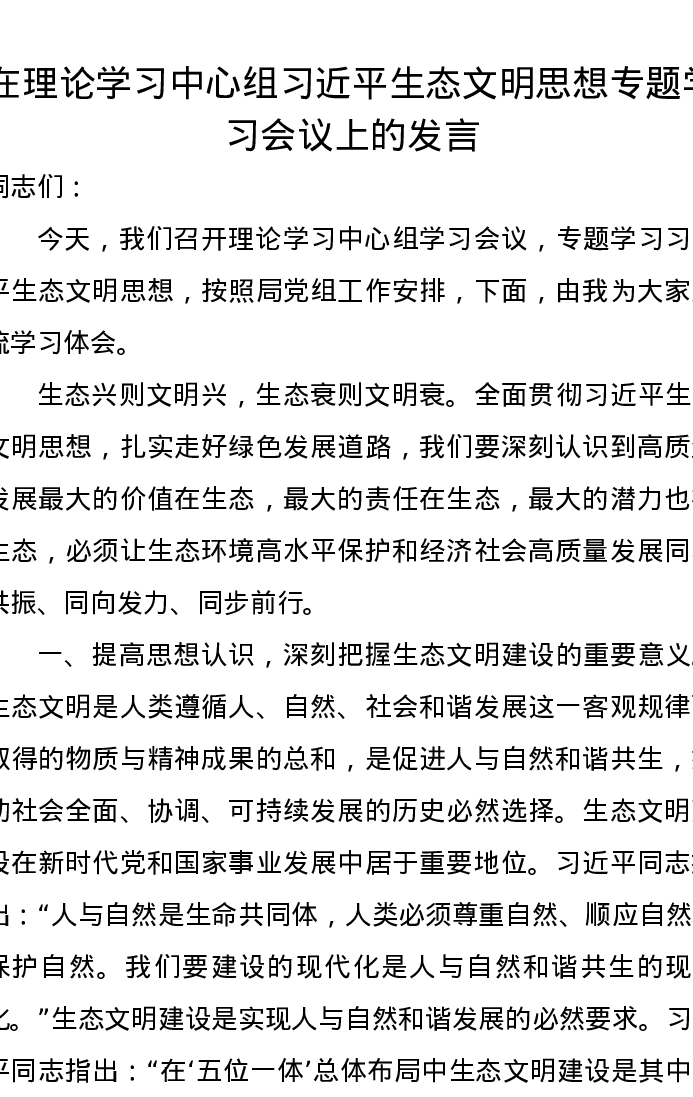 在理论学习中心组习近平生态文明思想专题学习会议上的发言