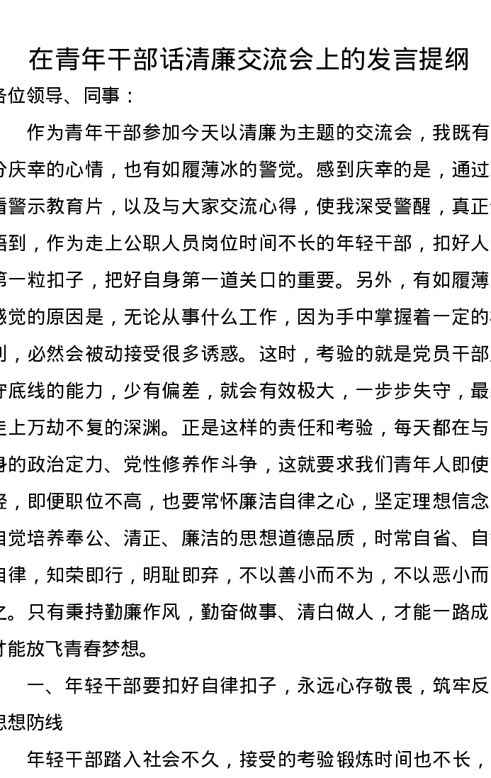 在青年干部话清廉交流会上的发言提纲