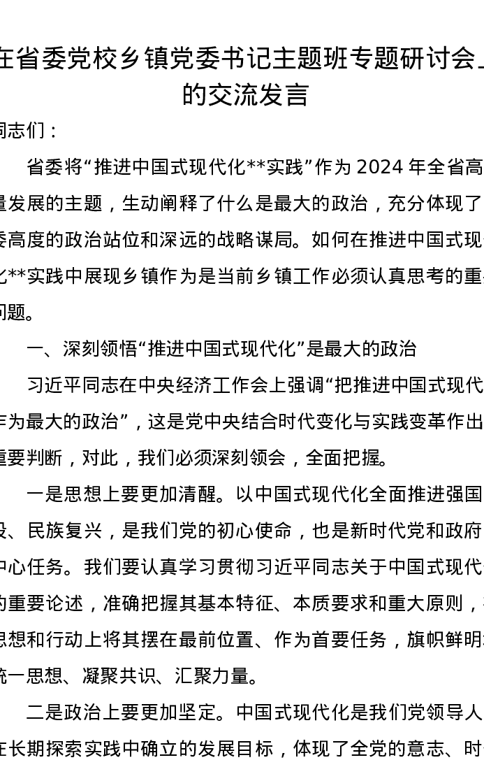 在省委党校乡镇党委书记主题班专题研讨会上的交流发言
