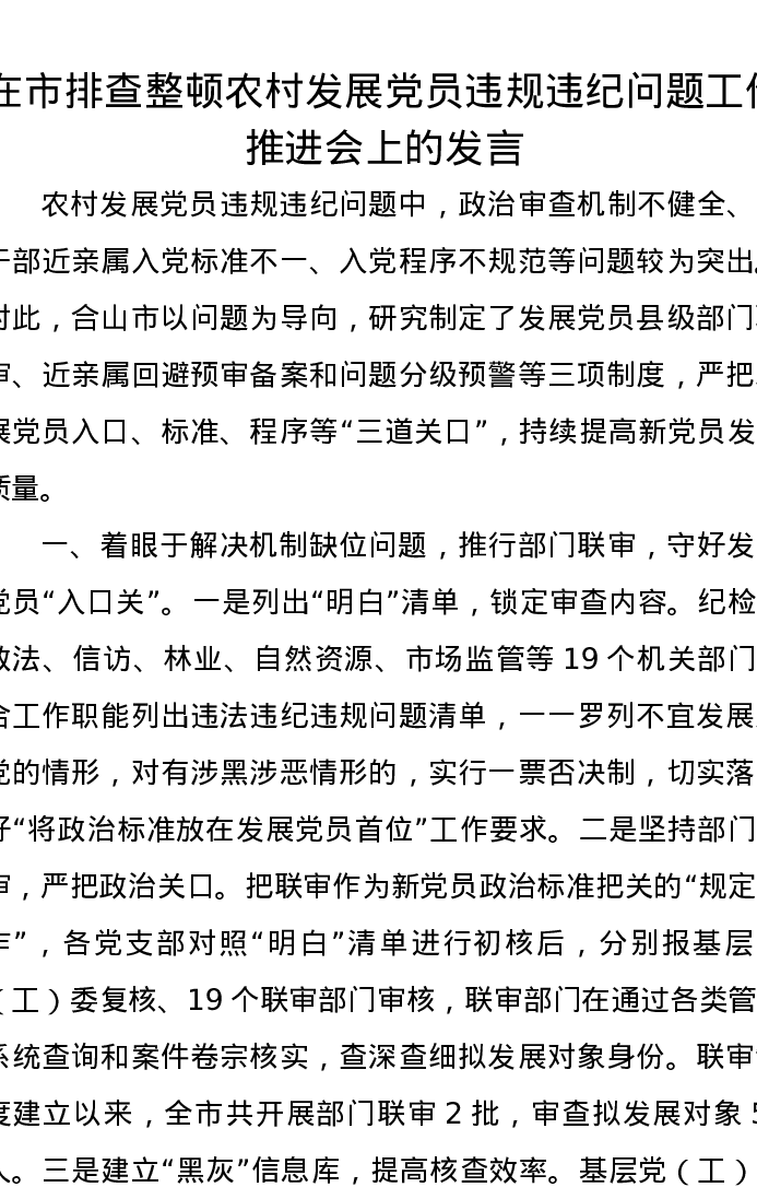 在市排查整顿农村发展党员违规违纪问题工作推进会上的发言