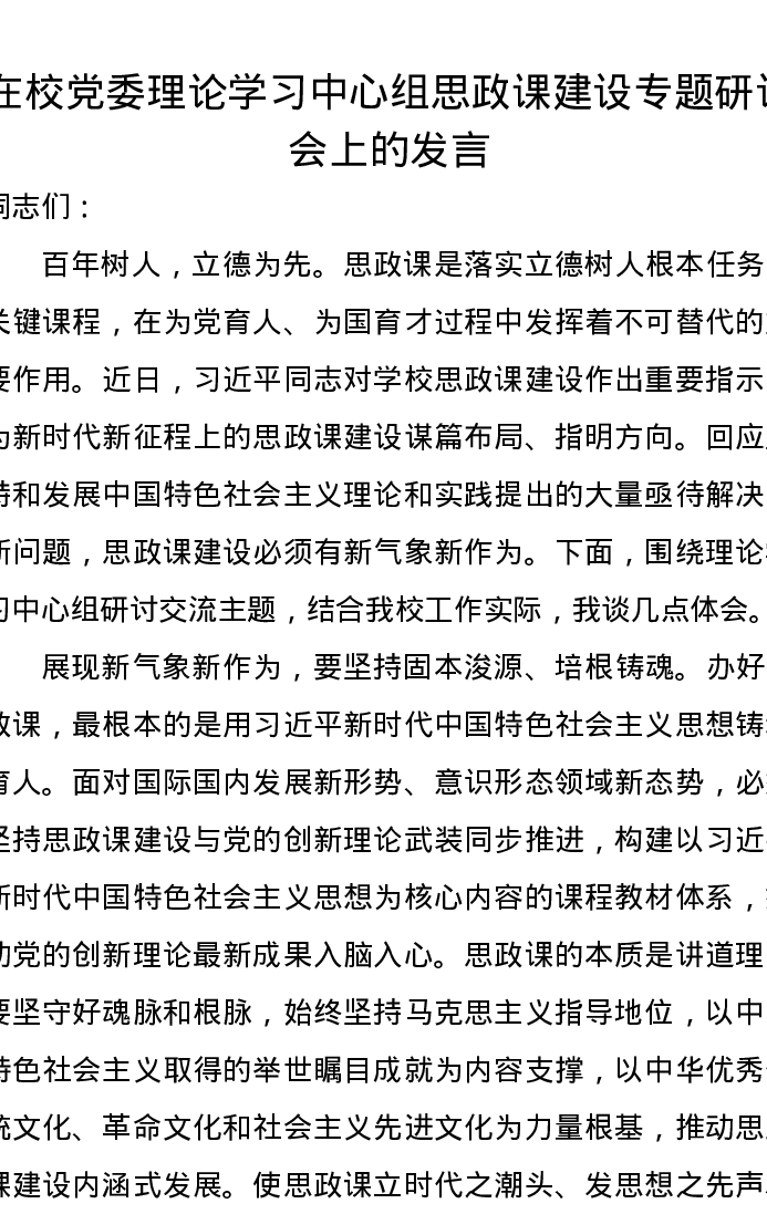 在校党委理论学习中心组思政课建设专题研讨会上的发言