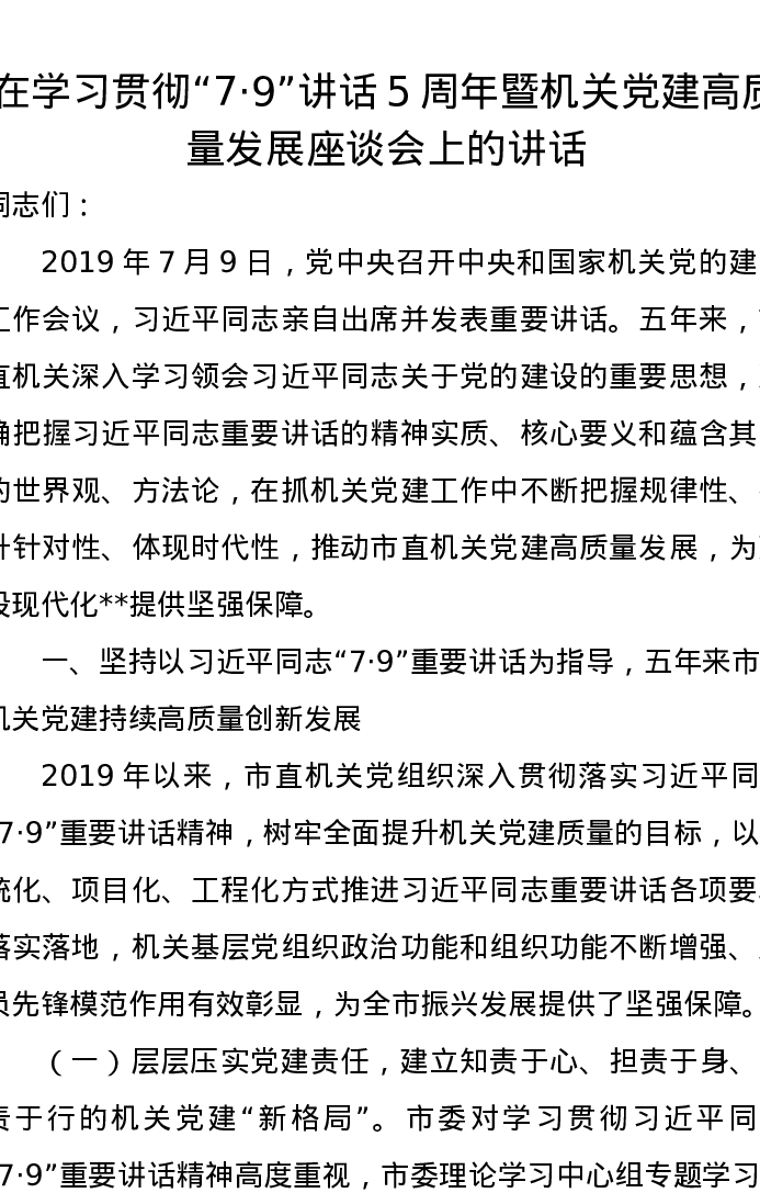在学习贯彻“7·9”讲话5周年暨机关党建高质量发展座谈会上的讲话