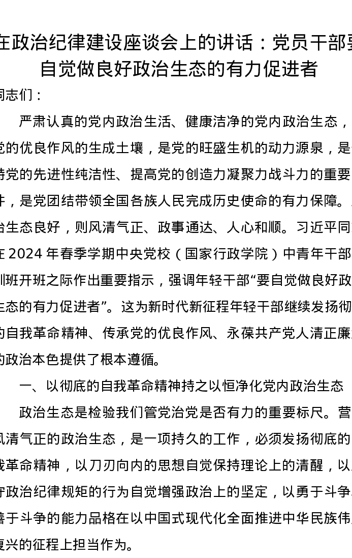在政治纪律建设座谈会上的讲话:党员干部要自觉做良好政治生态的有力促进者