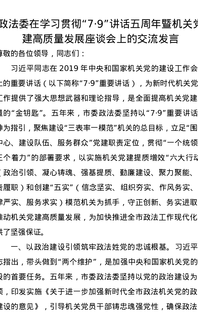 政法委在学习贯彻“7·9”讲话五周年暨机关党建高质量发展座谈会上的交流发言