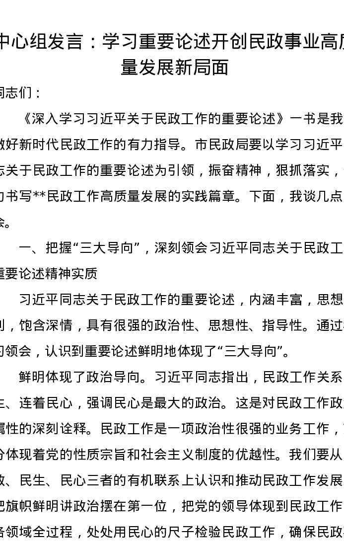 中心组发言:学习重要论述开创民政事业高质量发展新局面
