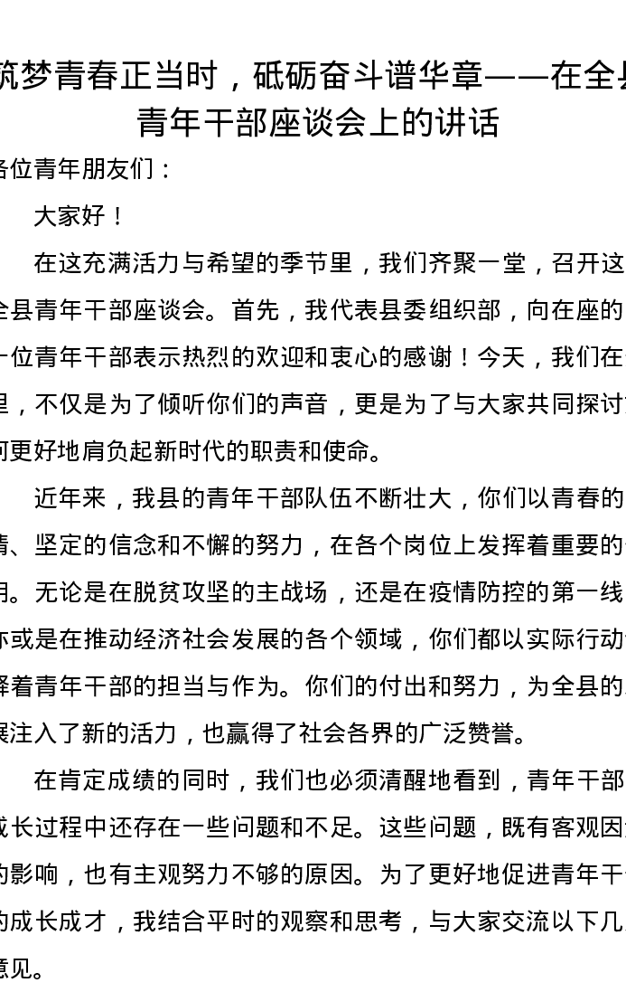 筑梦青春正当时,砥砺奋斗谱华章——在全县青年干部座谈会上的讲话