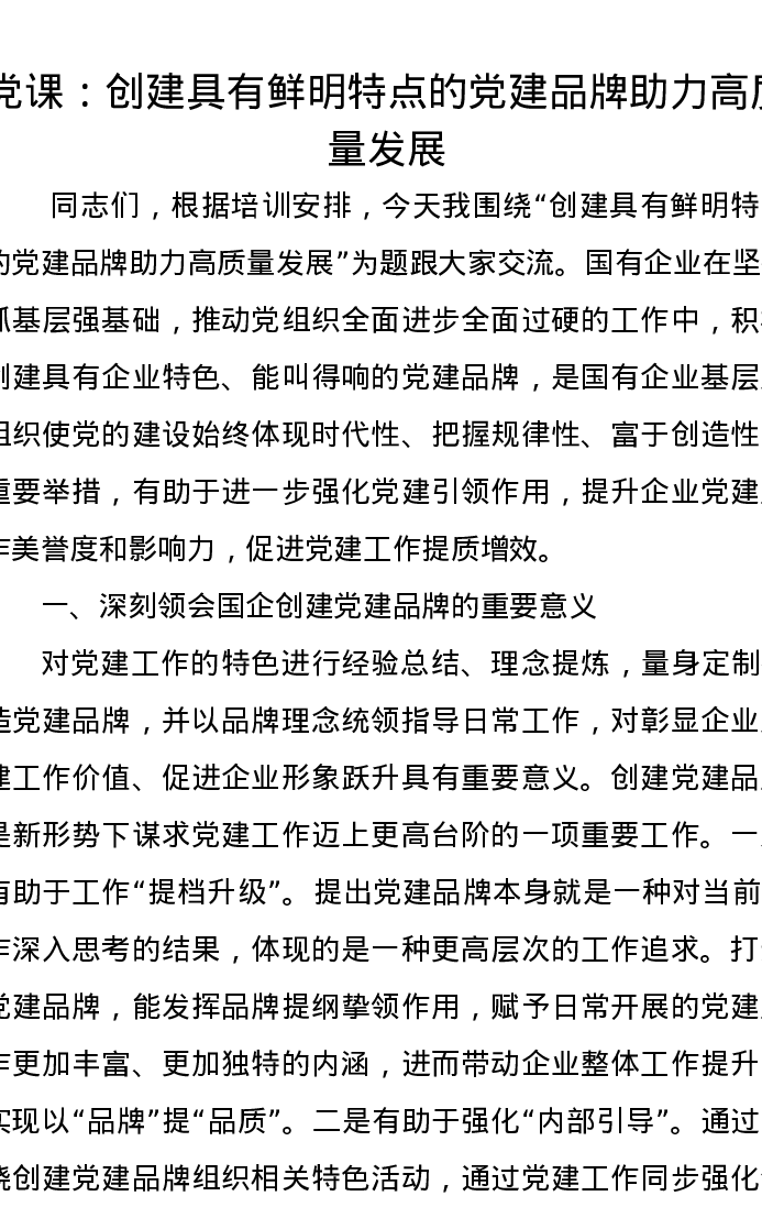 党课讲稿:创建具有鲜明特点的党建品牌助力高质量发展