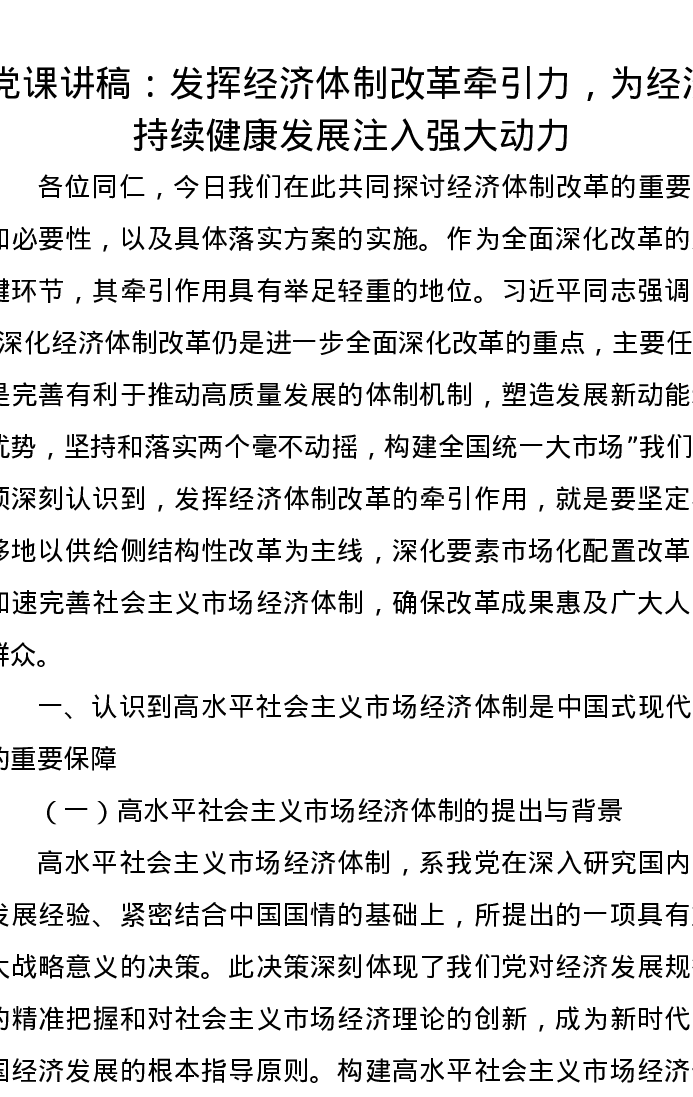 党课讲稿:发挥经济体制改革牵引力,为经济持续健康发展注入强大动力