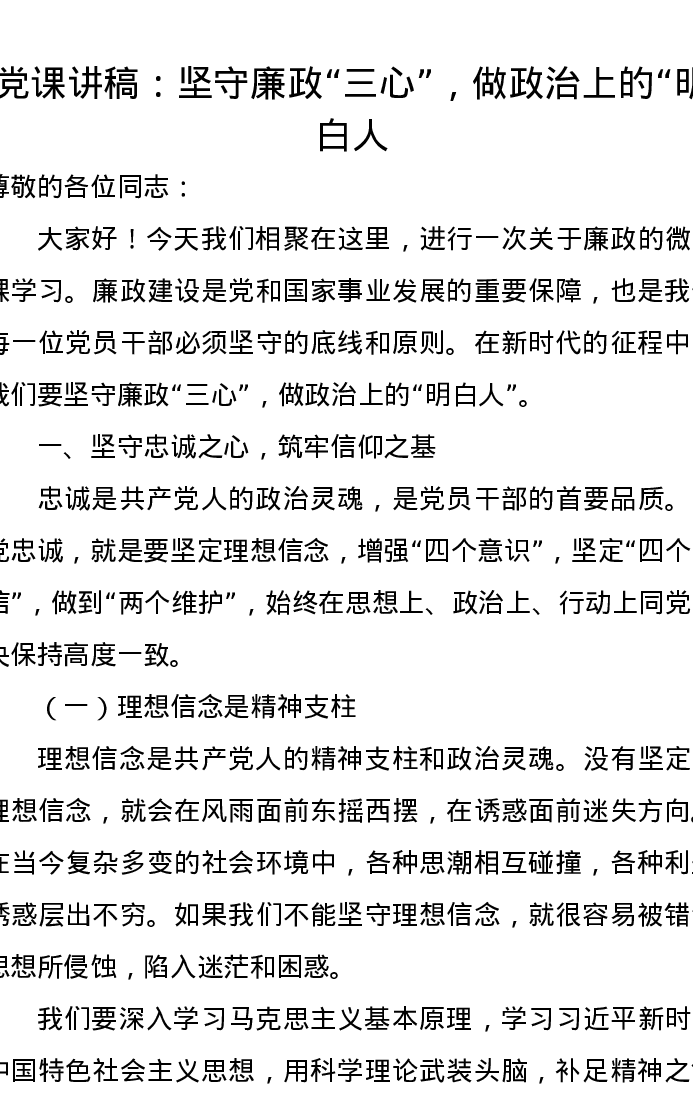 党课讲稿:坚守廉政“三心”,做政治上的“明白人