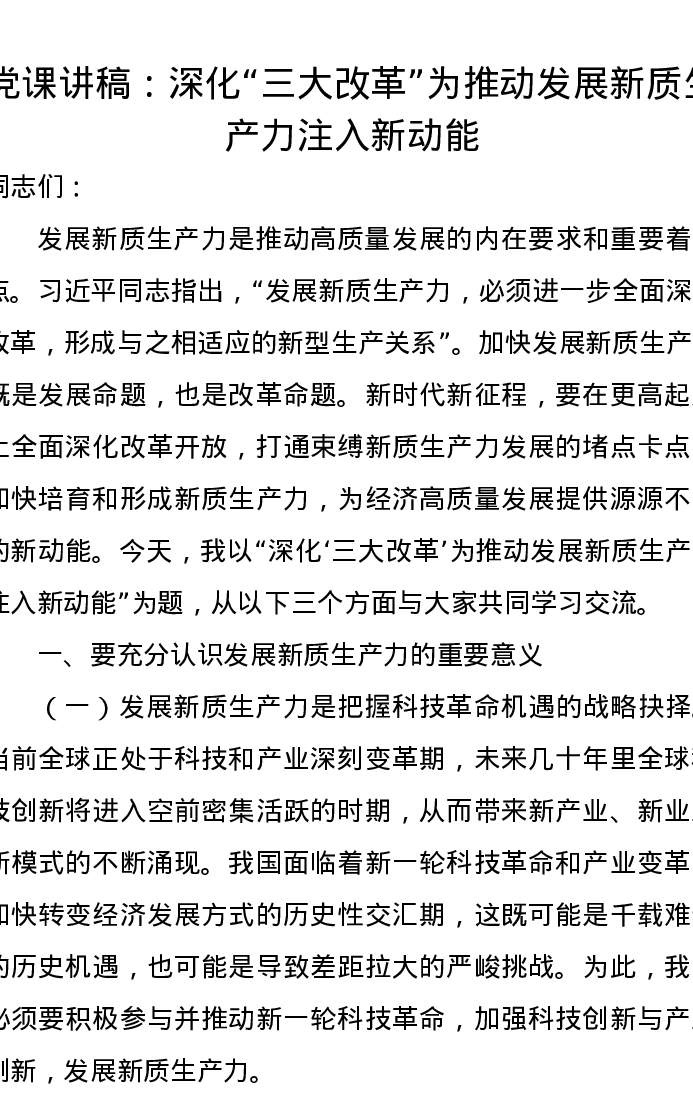 党课讲稿:深化“三大改革”为推动发展新质生产力注入新动能