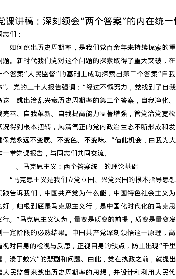 党课讲稿:深刻领会“两个答案”的内在统一性