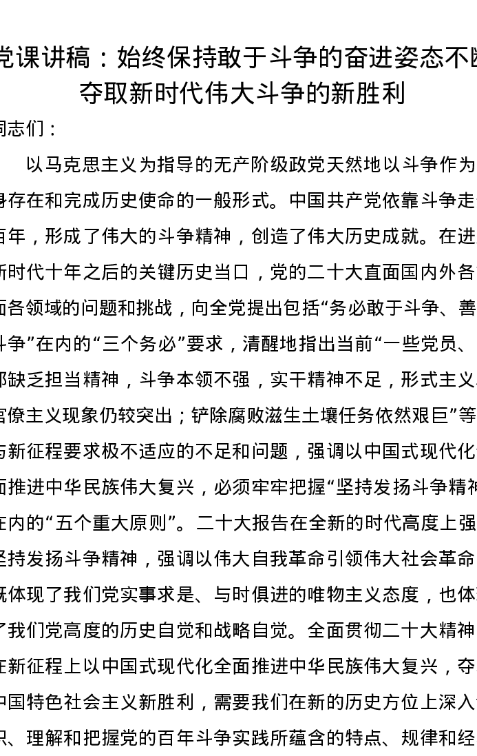 党课讲稿:始终保持敢于斗争的奋进姿态不断夺取新时代伟大斗争的新胜利