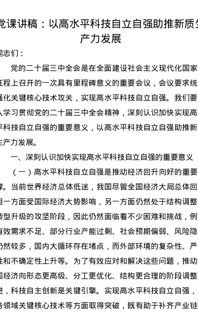 党课讲稿:以高水平科技自立自强助推新质生产力发展