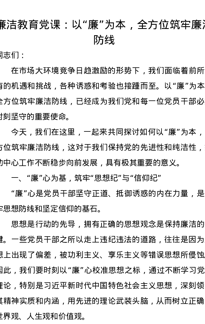 廉洁教育党课讲稿:以“廉”为本,全方位筑牢廉洁防线