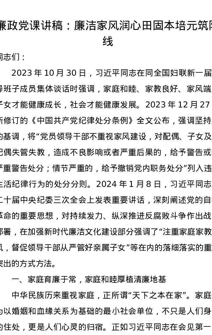 廉政党课讲稿:廉洁家风润心田固本培元筑防线