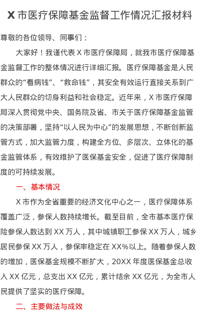 X市医疗保障基金监督工作情况汇报材料