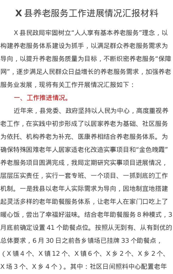 X县养老服务工作进展情况汇报材料