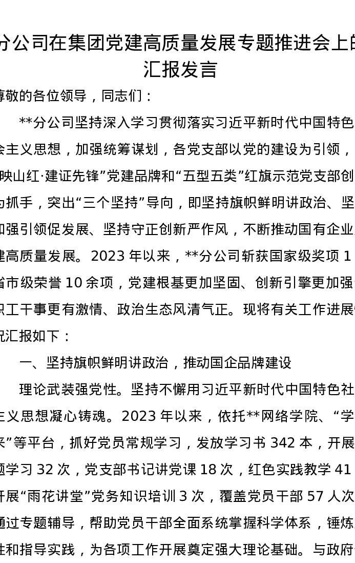 分公司在集团党建高质量发展专题推进会上的汇报发言