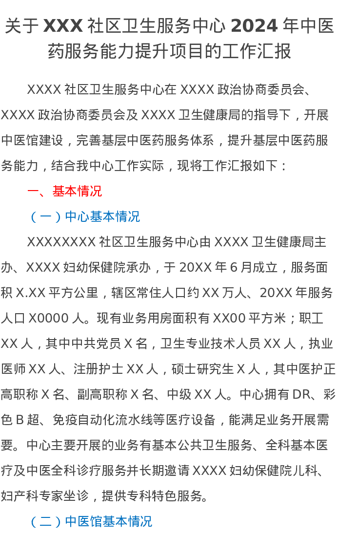 关于XXX社区卫生服务中心2024年中医药服务能力提升项目的工作汇报