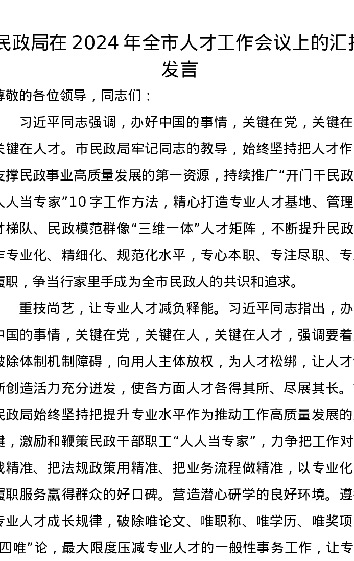 民政局在2024年全市人才工作会议上的汇报发言