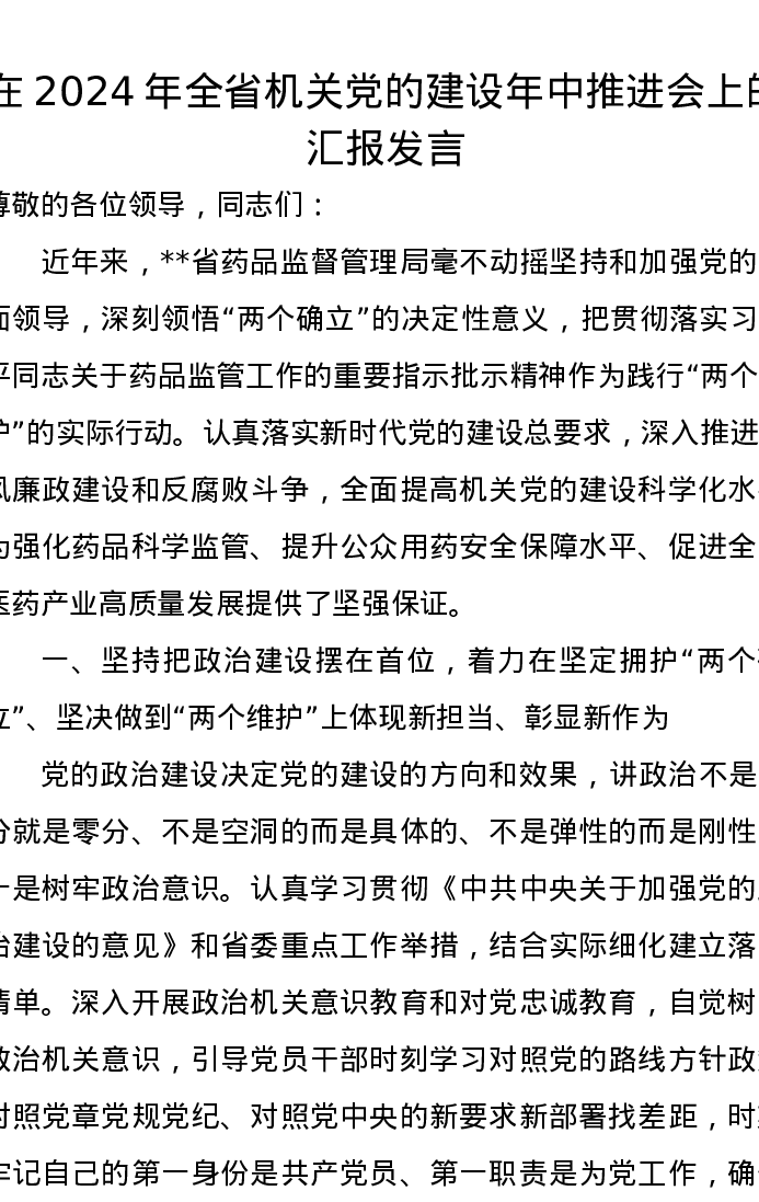 在2024年全省机关党的建设年中推进会上的汇报发言