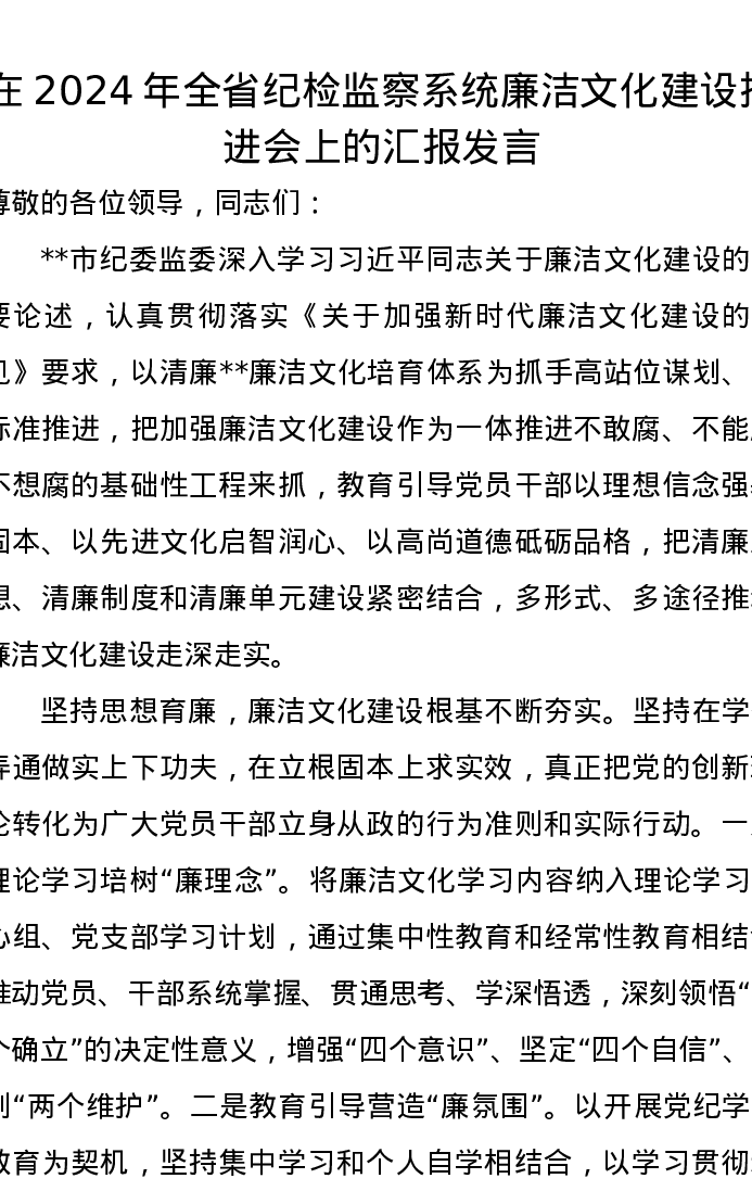 在2024年全省纪检监察系统廉洁文化建设推进会上的汇报发言