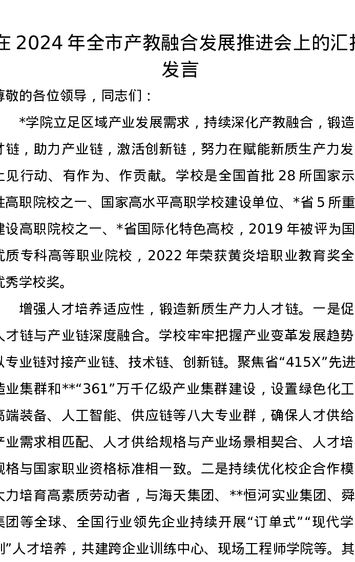 在2024年全市产教融合发展推进会上的汇报发言