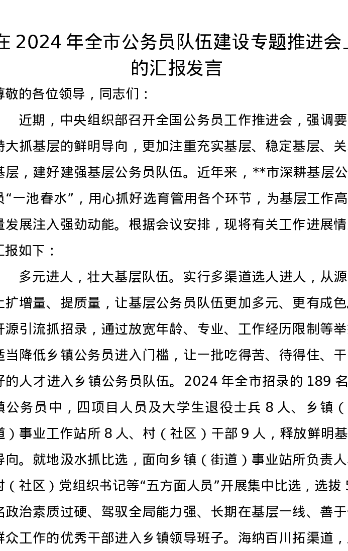 在2024年全市公务员队伍建设专题推进会上的汇报发言