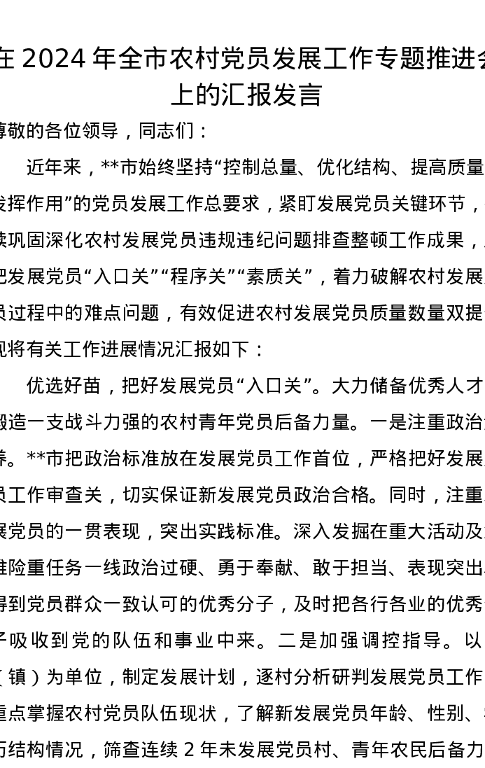 在2024年全市农村党员发展工作专题推进会上的汇报发言