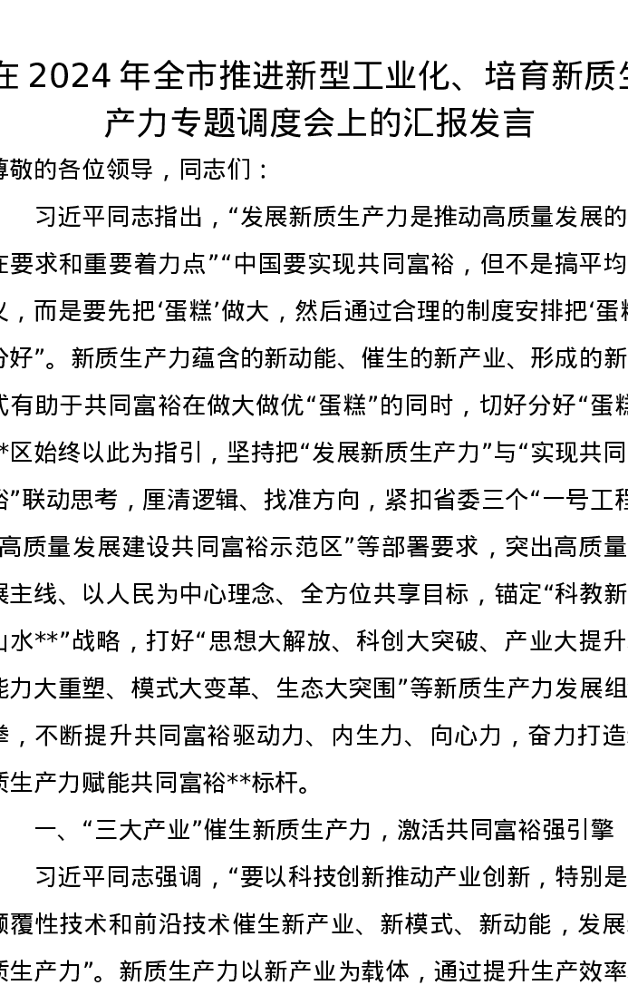 在2024年全市推进新型工业化、培育新质生产力专题调度会上的汇报发言