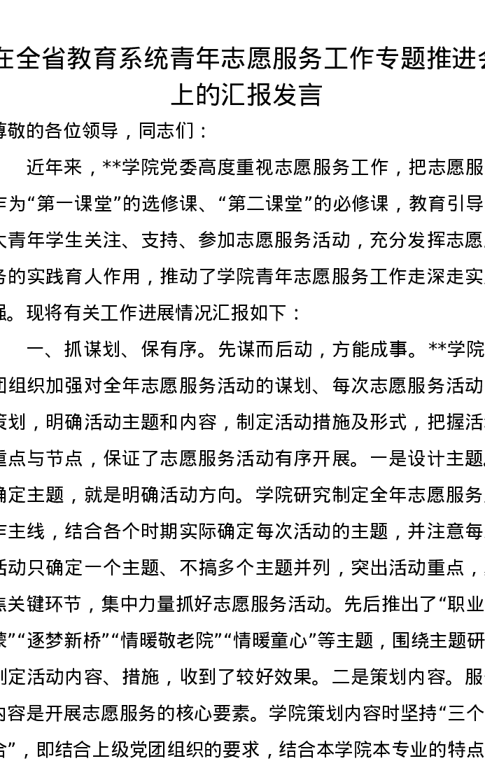 在全省教育系统青年志愿服务工作专题推进会上的汇报发言