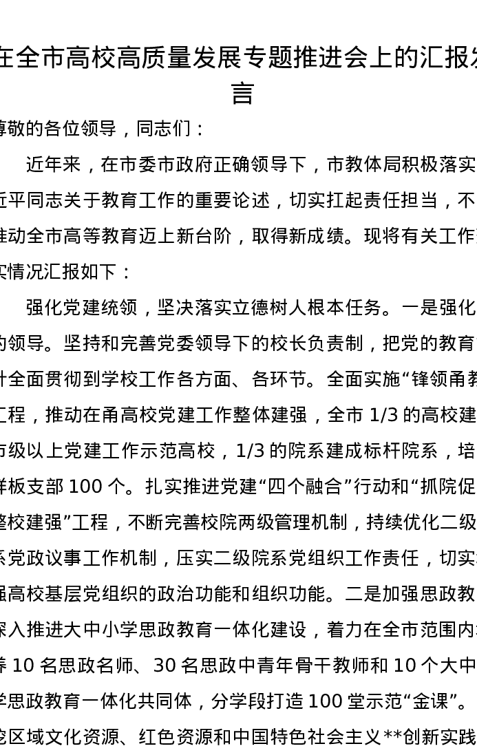 在全市高校高质量发展专题推进会上的汇报发言