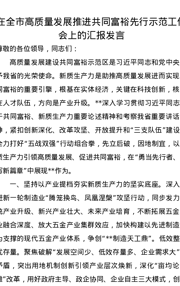 在全市高质量发展推进共同富裕先行示范工作会上的汇报发言